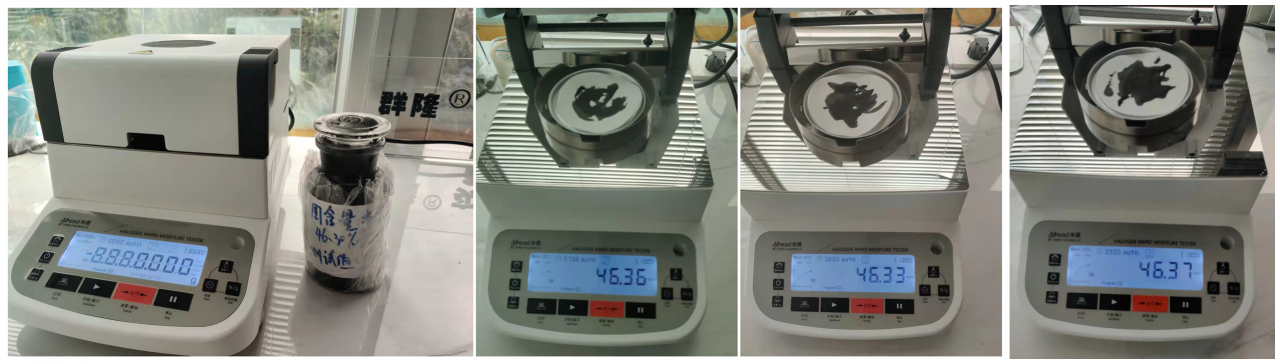 - 復(fù)位儀器,待儀器冷卻至40℃以下后,再取等量的漿料均勻涂在玻璃纖維紙上,重復(fù)上述測試步驟;測試結(jié)束后得出第二組數(shù)據(jù),顯示樣品的固含量為46.33%;第三組數(shù)據(jù),固含量為46.37%;根據(jù)客戶提供的參考數(shù)據(jù)46.30%,實(shí)際測試誤差小于客戶給出的誤差±0.5%,表示測試結(jié)果可靠,可重復(fù)性好。