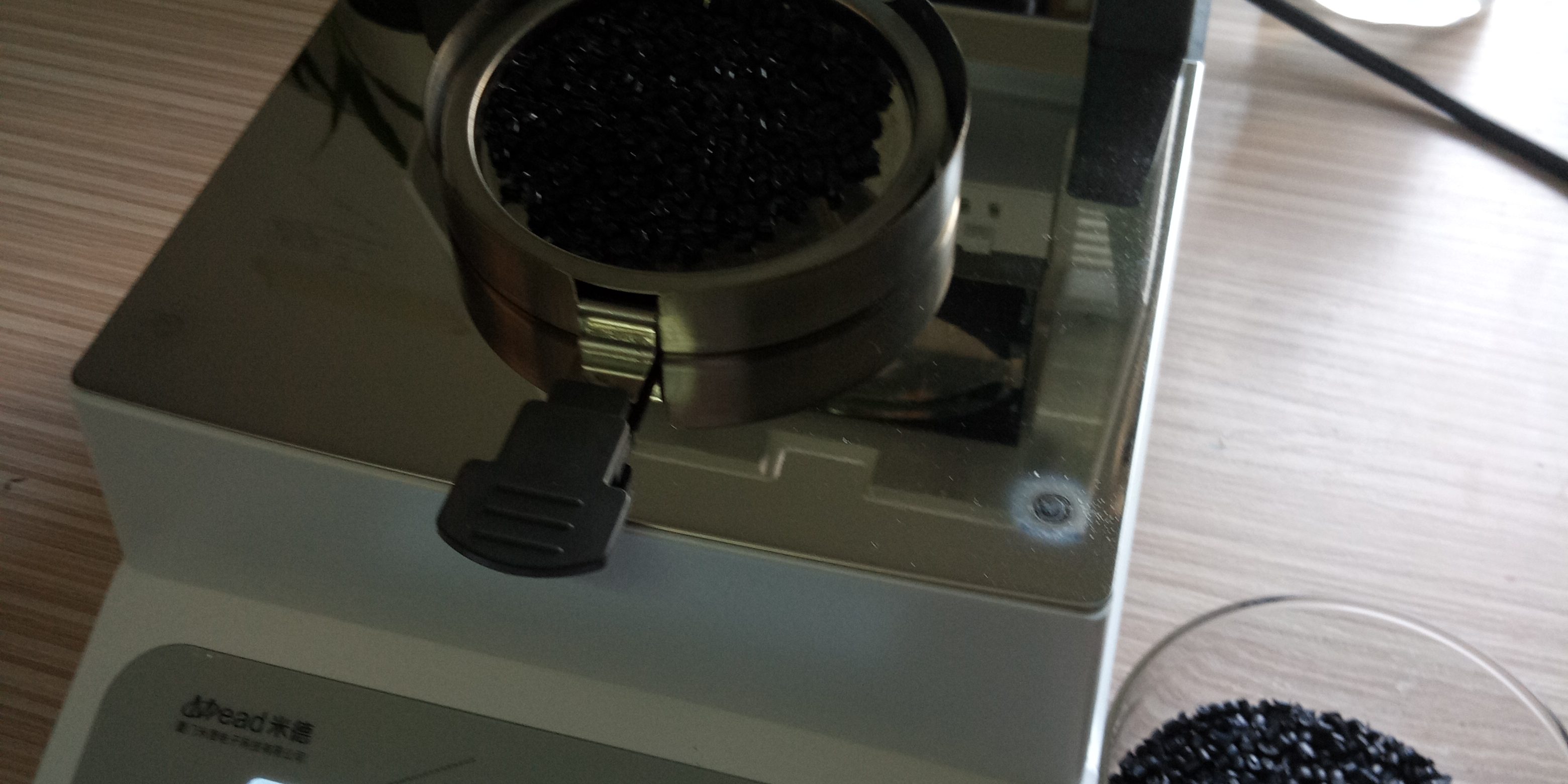 - 測(cè)試再生尼龍顆粒:倒出8克左右再生尼龍料顆粒倒在不銹鋼托盤中,為了使測(cè)試過(guò)程中再生尼龍水分儀將再生尼龍料烘干烘透,我們將尼龍顆粒攤成分散狀,以便溫度能滲透進(jìn)再生尼龍內(nèi)部。用鑷子將再生尼龍顆粒平鋪均勻,為避免尼龍顆粒烘烤后變焦變黑,我們將溫度設(shè)置在125℃,按“START”鍵開(kāi)始測(cè)試,5分40秒后檢測(cè)結(jié)束,檢測(cè)數(shù)據(jù)顯示0.67%;