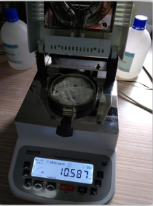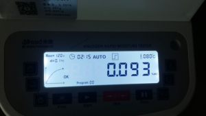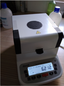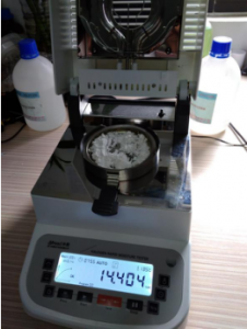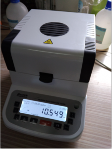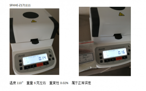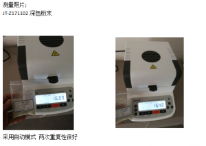 1、測試陶瓷粉末:為了使測試過程中將陶瓷粉末烘干烘透,我們將陶瓷粉末分散開來,以便溫度能滲透進陶瓷粉末內(nèi)部。取8克多陶瓷粉末撒于不銹鋼托盤中,用鑷子將陶瓷粉末平鋪均勻,為使陶瓷粉末經(jīng)過高溫度加熱后能夠徹底烘干,我們將溫度設置在105℃,按“START”鍵開始測試,1分鐘37秒后檢測結(jié)束,檢測數(shù)據(jù)顯示0.30%;